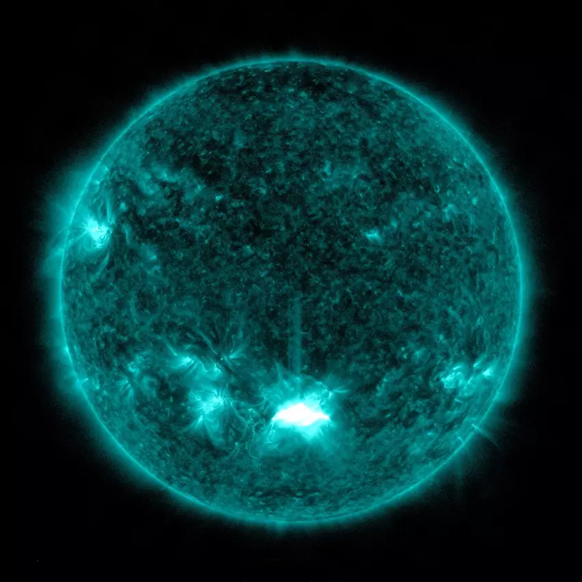 Intensive helle Sonneneruption deutlich sichtbar in der unteren Hälfte der Sonne. Die NASA veröffentlichte auch einen Tweet, der Bilder in verschiedenen Wellenlängen zeigt. Die Animation ist sehr interessant und zeigt, wie die Sonne große Mengen an Material in den Weltraum schleudert.