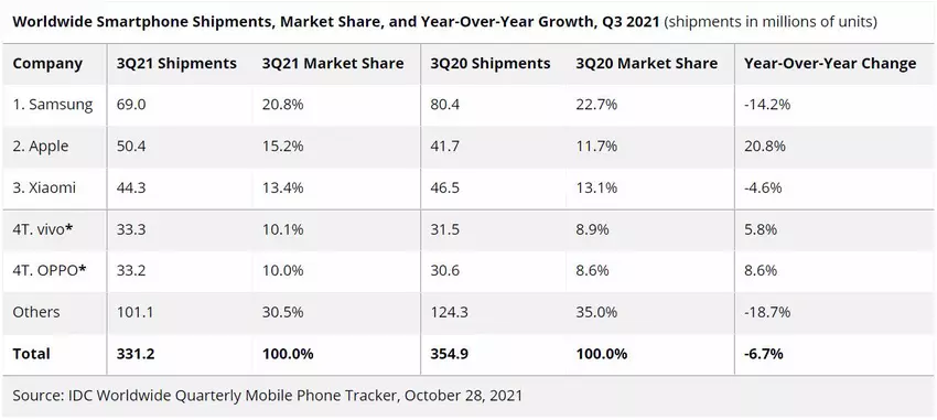 IDC hat die Ergebnisse seiner Smartphone-Marktstudie für das dritte Quartal 2021 veröffentlicht. Samsung ist weiterhin führend, aber im Vergleich zum dritten Quartal 2020 hat Apple den Abstand halbiert.