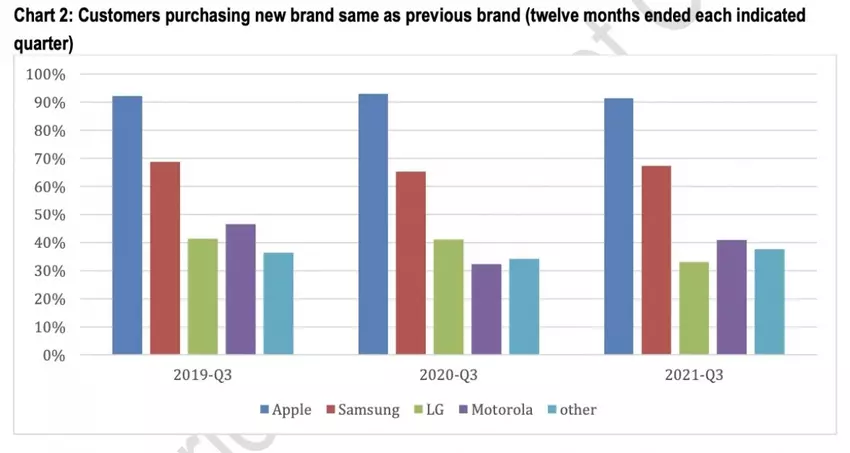 Wer hat die Nase vorn? Niemand bezweifelte , dass Apple die stärkste Position innehat. Die Studie ergab, dass über 90 % der iPhone-Nutzer der Marke treu bleiben, d. h. sie kaufen als ein neues Smartphone-Modell desselben Unternehmens .