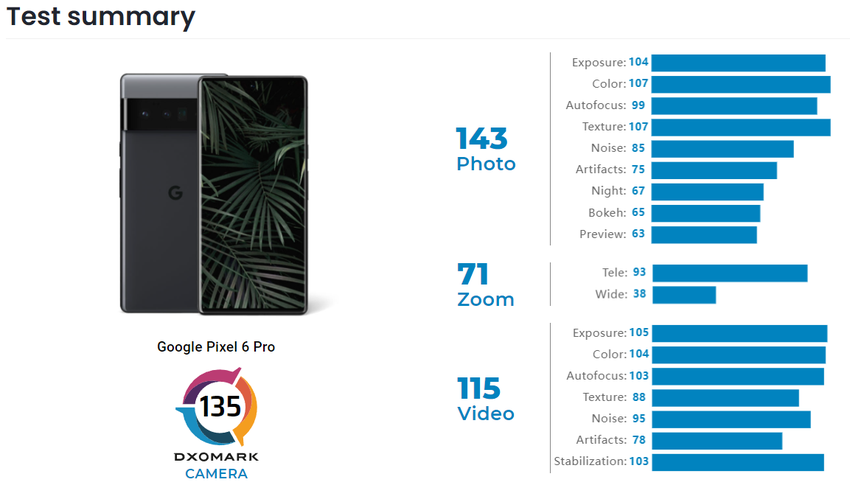 Dennoch erhielt das Google Pixel 6 Pro 143 Punkte für Fotografie, während die Videofähigkeiten mit 115 Punkten bewertet wurden. Im Vergleich dazu hat der Spitzenreiter der Rangliste, das Huawei P50 Pro, 149 bzw. 126 Punkte erreicht.