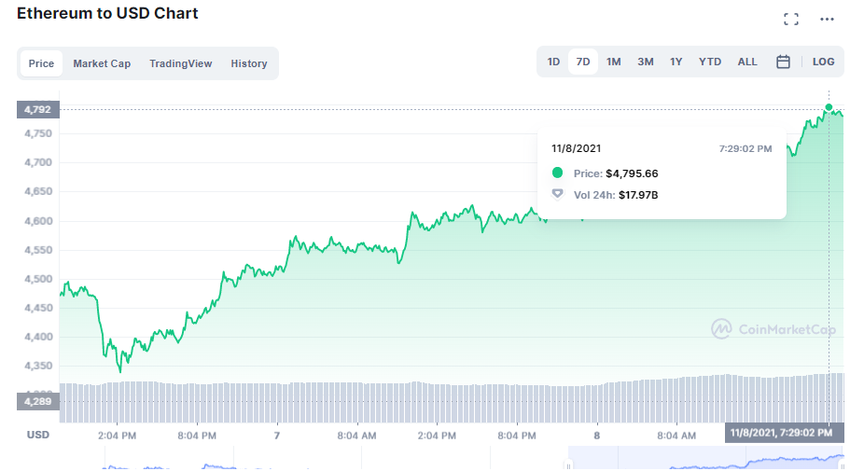 Die zweitbeliebteste digitale Währung legte über Nacht um etwa 4% zu. Sein Wert liegt jetzt bei 4.778 Dollar (20:50 Uhr Kiewer Zeit), aber noch vor wenigen Stunden war ein einziger Ethereum-Coin 4.795,66 Dollar wert.