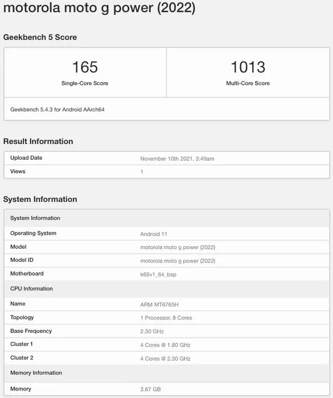 Es handelt sich um das Moto G Power (2022). Das Smartphone ist in der Geekbench-Leistungstest-Datenbank aufgetaucht. Dem Bericht zufolge wird das Gerät mit einem Octa-Core MediaTek MT6765H Prozessor mit PowerVR Rogue GE8320 Grafik ausgestattet. Offenbar handelt es sich um den Helio G35-Chipsatz. Die Neuheit wird auch 4 GB RAM und Android 11 Betriebssystem out of the box haben.