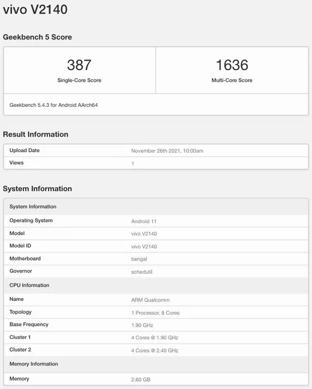 Das Gerät wird mit der Modellnummer V2140 geliefert. Gerüchten zufolge soll es sich um das Vivo Y21e handeln. Laut Bericht wird das Smartphone von einem Chip angetrieben Qualcomm, Codename Bengal. Die Rede ist vom neuen Snapdragon 680-Prozessor, der Ende Oktober debütierte. Das heißt, das Vivo Y21e wird das erste bzw. eines der ersten Smartphones sein, das den neuen Qualcomm-SoC erhält.