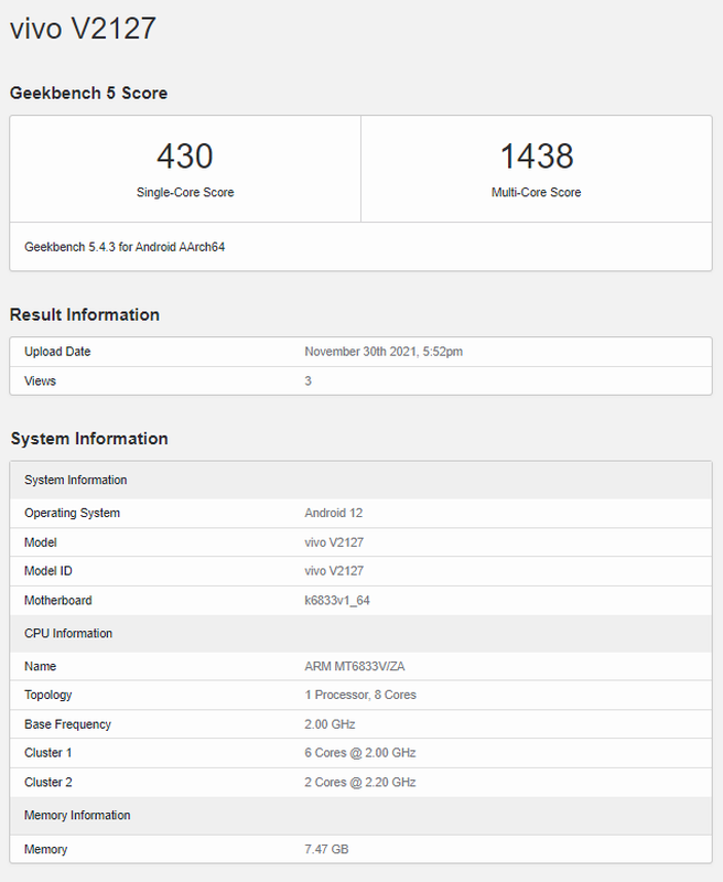 Vivo V55 mit Dimensity 700 und Android 12 auf Geekbench getestet