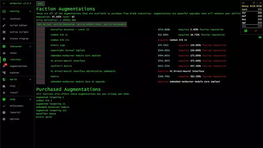 Auf der Erkundung der anti-utopischen Welt der Zukunft treffen Sie neue Leute und finden neue Netzwerke für Durchdringung und Kompromisse - oder Fraktionen, mit denen Sie sich vereinigen können. Sie können auch neue Cyberpunk-Ergänzungen erhalten, indem Sie Ihren Körper und Ihr Netzwerk auf ein immer höheres Niveau heben und die Statistiken Ihres Charakters entwickeln. Es gibt auch nette Minispiele, wie den Aktienhandel, die geöffnet und gemeistert werden können.