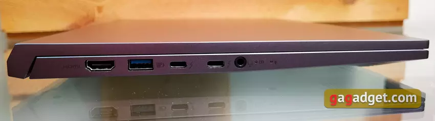 Auf der linken Seite befinden sich HDMI 2.1, USB 3.2 Gen 2 mit der Funktion, Geräte aufzuladen, wenn das Notebook ausgeschaltet ist, zwei Typ-C Version 4 mit Power Delivery, DisplayPort und Thunderbolt 4, eine kombinierte 3,5-Audio-Buchse und Statusanzeigen.