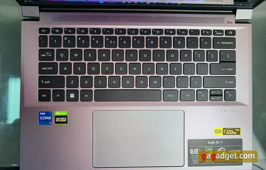 Das Notebook lässt sich bis zu einem Winkel von etwa 135° aufklappen. Die Scharniere sind komfortabel: Der Deckel rastet gut ein, und der Bildschirm wackelt kaum, wenn man ihn versehentlich anstößt. Die Tastatur des Acer Swift X 14 ist ganz normal für die ultraportablen Laptops des Unternehmens: volle Größe, ohne einen zusätzlichen Nummernblock. Es wird also nicht lange dauern, sich daran zu gewöhnen. Die obere Reihe der Funktionstasten ist kleiner. Lautstärke, Helligkeit, Tastaturbeleuchtung und andere Zusatzfunktionen werden über Fn und die F-Reihe aktiviert. Die Reihe endet mit der Power-Taste mit integriertem Fingerabdruckscanner. Home, Ende, PgUp und PgDn werden mit Pfeilen über Fn dupliziert. Der Navigationsblock ist nicht separat, aber die linken und rechten Pfeile sind in voller Größe. Sowohl Shift als auch Enter sind lang, Enter ist einstufig.