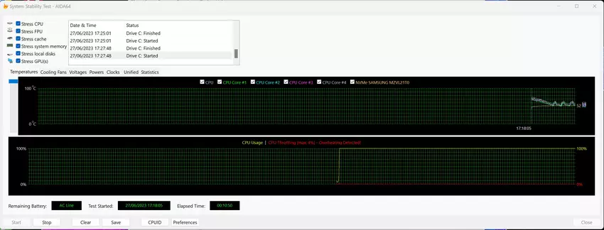 Das Kühlsystem des Laptops erweist sich als sehr effizient. Selbst bei maximaler Auslastung ist das Notebook nicht sehr laut, und das Lüftergeräusch selbst ist nicht störend. Nur der Bereich oberhalb der Tastatur wird warm, die Tastatur selbst erwärmt sich nicht. Im AIDA64-Stresstest stieg die Temperatur bei maximaler Auslastung zunächst auf etwa 80° an und blieb dann im Bereich von 50-65°. Der Laptop arbeitet also stabil und ohne Leistungseinbußen.