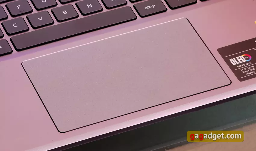 Das Touchpad ist recht groß. Acer nennt es OceanGlass, obwohl es in Wirklichkeit nicht aus Glas besteht. Es ist eine Mischung aus umweltfreundlichem ABS-Polymer und recyceltem Plastik aus den Ozeanen. Die Oberfläche ist sehr angenehm, sie erinnert wirklich an ein Glas-Touchpad. Die Empfindlichkeit ist gut und die Bedienung ist sehr angenehm. In den meisten Fällen braucht man keine Maus.