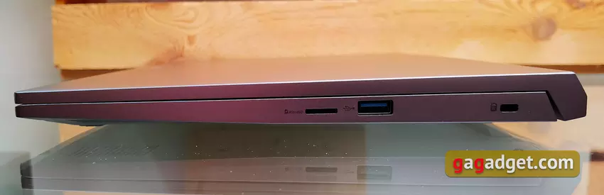 Das Notebook verfügt über eine sehr gute Ausstattung an Anschlüssen, insbesondere wenn man bedenkt, dass es sich um ein kompaktes Modell handelt. Auf der rechten Seite befindet sich ein MicroSD-Kartensteckplatz, ein USB 3.2 Gen 1-Anschluss in voller Größe und ein Kensington Lock-Anschluss.