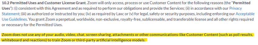 Das aktualisierte Dokument besagt, dass Zoom keine Audio- und Videoaufnahmen, Chats, Anhänge oder andere Nachrichten verwendet, um Modelle der künstlichen Intelligenz zu trainieren. Auch gibt das Unternehmen diese Daten nicht an Drittentwickler weiter.
