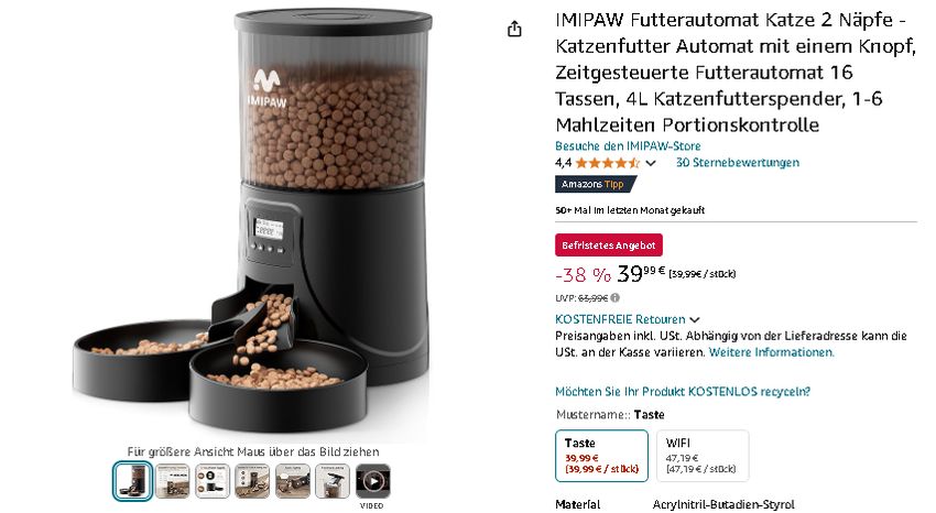Der IMIPAW Futterautomat ist momentan für 39,99 € erhältlich, reduziert von 63,99 € - das entspricht einer Ersparnis von 38%! Ein Angebot, das den Alltag von Haustierbesitzern erleichtern wird.