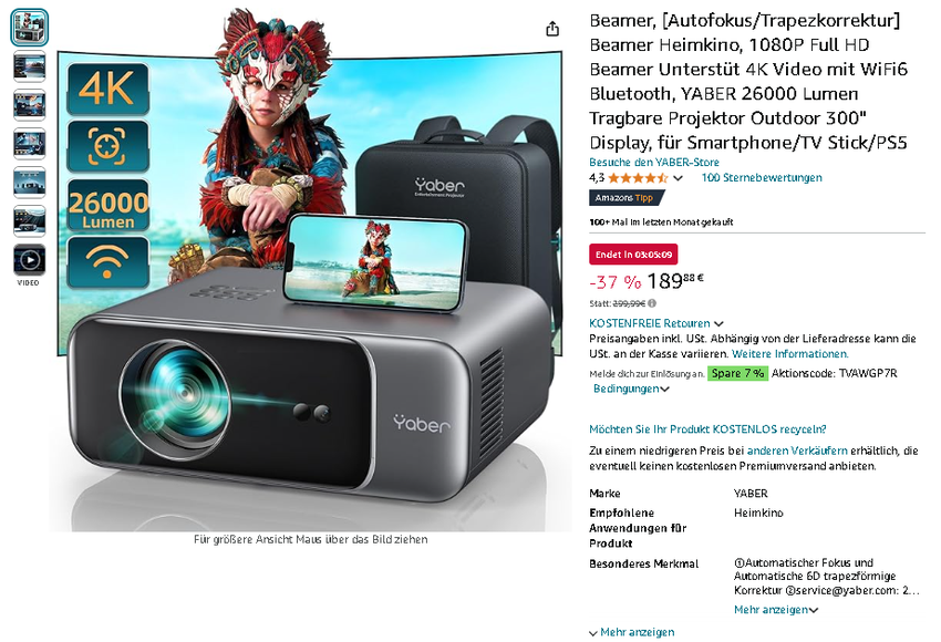 Der hochmoderne Yaber Pro V9 Beamer ist momentan für 189,88 € verfügbar, herabgesetzt von 299,99 € - eine beachtliche Ersparnis von 37%! Ein Angebot, das Kinoträume wahr werden lässt.