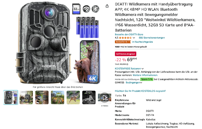 Die DEATTI Wildkamera ist aktuell für 69,99 € statt 89,99 € erhältlich - eine attraktive Ersparnis von 20 € (22%)!