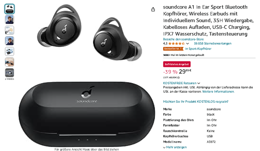 Die Soundcore A1 Sport sind aktuell für 29,99 € statt 48,99 € verfügbar - eine attraktive Ersparnis von 19 € (39%)!