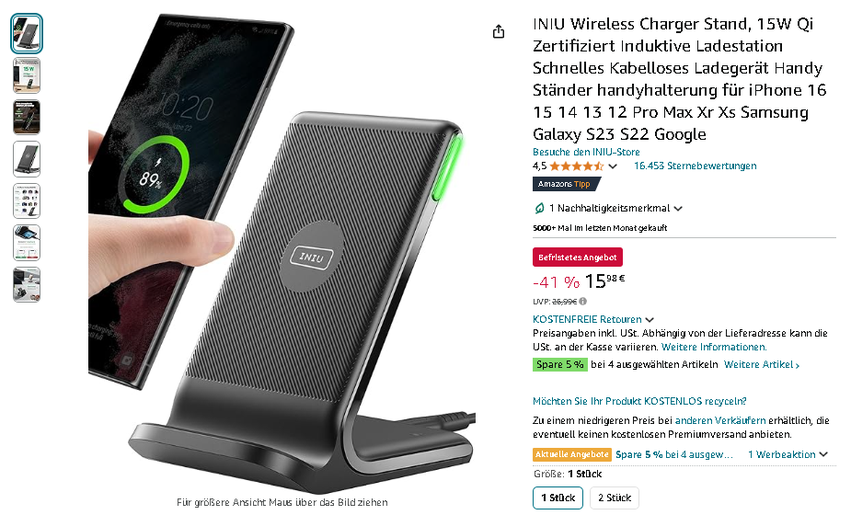 Der INIU Wireless Charger ist jetzt für 15,98 € statt 26,99 € erhältlich - eine beachtliche Ersparnis von 11,01 € (41%)!