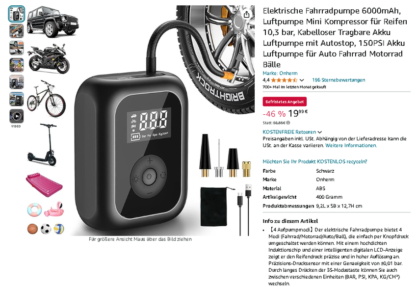 Der praktische Kompressor ist jetzt für nur 19,99 € zu haben, statt 36,85 € - ein toller Rabatt von 46%!