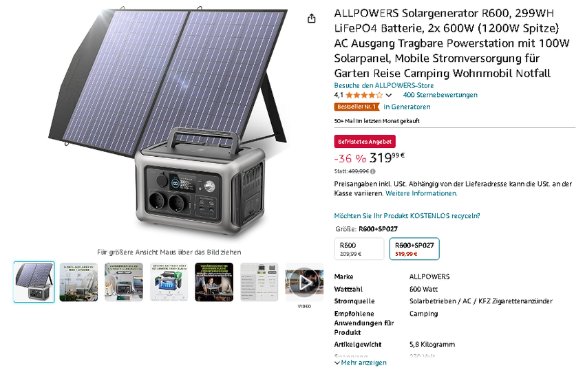 Das komplette Solar-Set ist derzeit für 319,99 € erhältlich, statt 499,99 € - eine beachtliche Ersparnis von 36%!