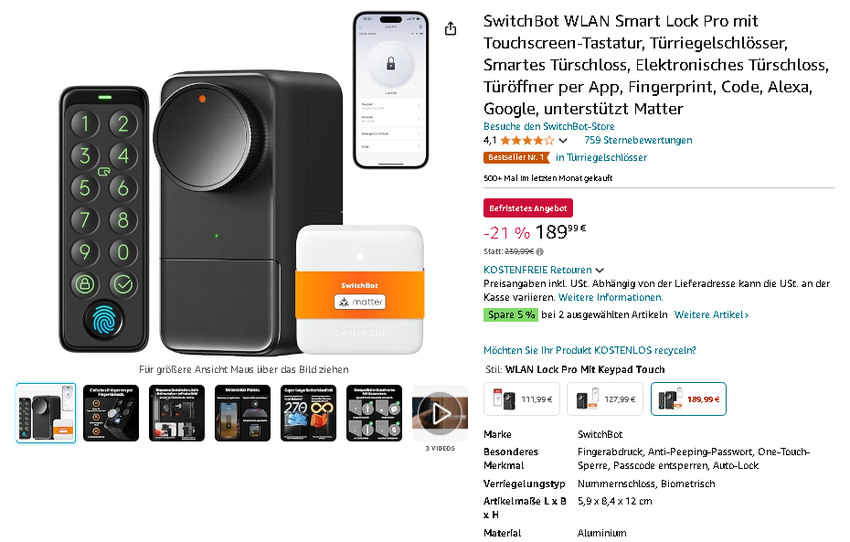 Das SwitchBot Smart Lock Pro ist momentan für 189,99 € statt 239,99 € verfügbar - eine attraktive Ersparnis von 21%!