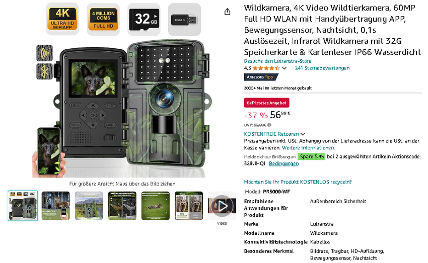 Lutranstra PR5000-WF Wildkamera – Jetzt 33€ sparen!