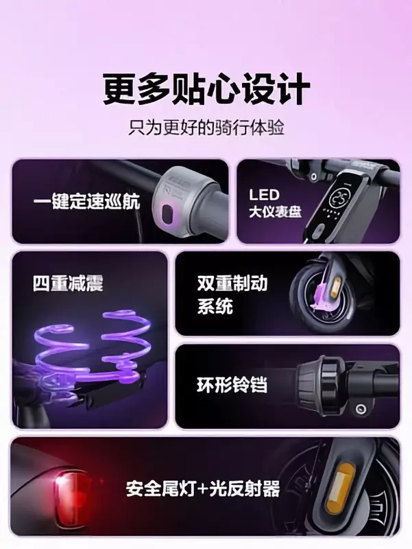 Die Neuheit ist nicht klein, denn sie hat ein großes Fach unter der Batterie und dem Fahrersitz. Ninebot UiFi ist nur 1,2 m lang und hat eine niedrige Landung. Das Gerät wiegt 33 kg.