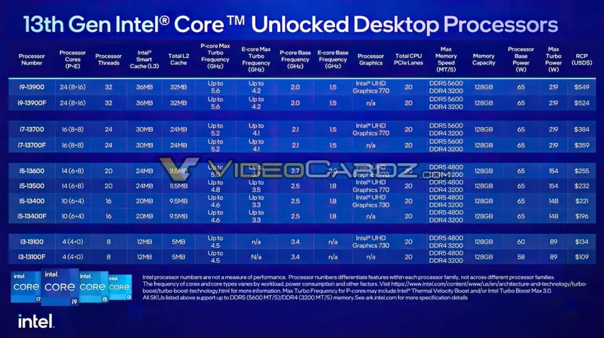 Das günstigste neue Produkt ist der Core i3-13100F. Er hat vier leistungsstarke Kerne mit 3,4-4,5 GHz und kostet 109 Dollar. Das gleiche Modell, aber mit UHD 730-Grafik, wird 134 US-Dollar kosten. Der teuerste Prozessor ist der Core i9-13900. Er hat 24 Kerne (8P + 16E), 32 Threads und eine Frequenz von 2,0-5,6 GHz und kostet 549 Dollar,