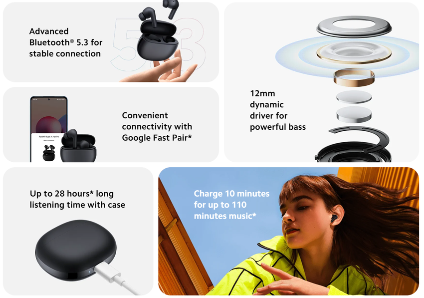 Die Redmi Buds 4 Active halten im Musikmodus bis zu 5 Stunden durch. Ein Ladecase mit einem 440-mAh-Akku verlängert die Laufzeit auf 28 Stunden. Die Kopfhörer unterstützen auch das schnelle Aufladen - aus 10 Minuten werden 2 Stunden Nutzungsdauer.