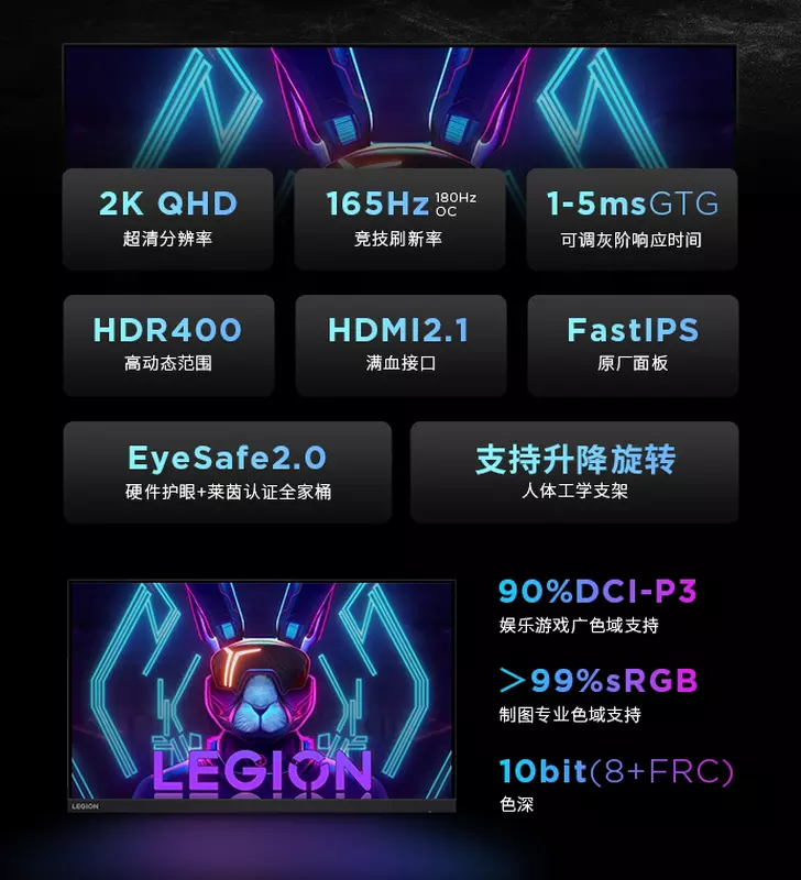 Die Neuheit wurde auf den Namen Lenovo Legion R27q getauft. Der Monitor erhielt ein 27-Zoll-Display mit FastIPS-Matrix und QHD-Auflösung. Das Panel hat eine DCI-P3-Farbabdeckung von 90 % und eine sRGB-Abdeckung von über 99 %. Der Monitor bietet außerdem 10-Bit-Farbtiefe (8+FRC), HDR400 High Dynamic Range, 1-5ms Reaktionszeit und Unterstützung für Bildwiederholfrequenzen bis zu 180Hz. Das neue Produkt verfügt über eine TÜV Rheinland-Zertifizierung. Der Monitor wird mit einem verstellbaren Standfuß geliefert und verfügt über verschiedene Anschlüsse, darunter HDMI 2.1.
