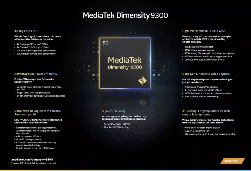 Der Chip hat den Namen Dimensity 9300. Der SoC basiert auf der 4nm+ TSMC-Prozesstechnologie der dritten Generation. Er zeichnet sich durch sein Multi-Core-Design aus: ein einzelner Cortex-X4-Kern, der mit 3,25 GHz getaktet ist, drei Cortex-X4-Kerne, die mit 2,85 GHz getaktet sind, und vier Cortex-A720-Kerne, die mit 2,0 GHz getaktet sind und auf der Armv9-Architektur basieren.