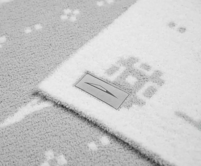 Überraschenderweise handelt es sich um ein Plaid namens Cybersoft. Darauf sind kleine Cybertruck-Silhouetten und Bilder von Schneeflocken zu sehen.