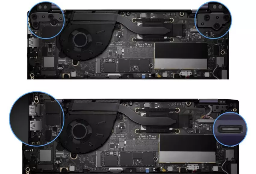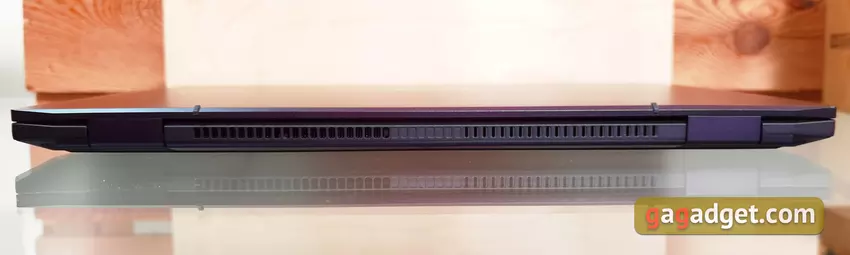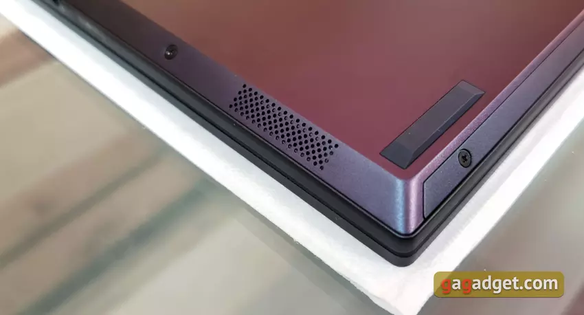 An der Unterseite des Laptops befinden sich zahlreiche Lüftungsöffnungen. Auf der Rückseite befindet sich ein Gummieinsatz, der fast die gesamte Breite des Laptops einnimmt, vorne gibt es zwei weitere Gummifüße für einen sicheren Stand auf dem Tisch. Näher an der Vorderseite des Laptops befinden sich Stereo-Lautsprecher an den Seiten. Die untere Abdeckung ist mit zehn Schrauben mit einem Standard-Kreuzschlitz befestigt, so dass es nicht sehr schwierig sein wird, sie zu entfernen. Dadurch wird es möglich, eine zweite M.2-SSD zu ersetzen oder hinzuzufügen. Sie können im RAID0/1-Modus arbeiten. Es gibt auch einen freien Steckplatz für RAM. Ziemlich gut, für ein so kompaktes Modell.