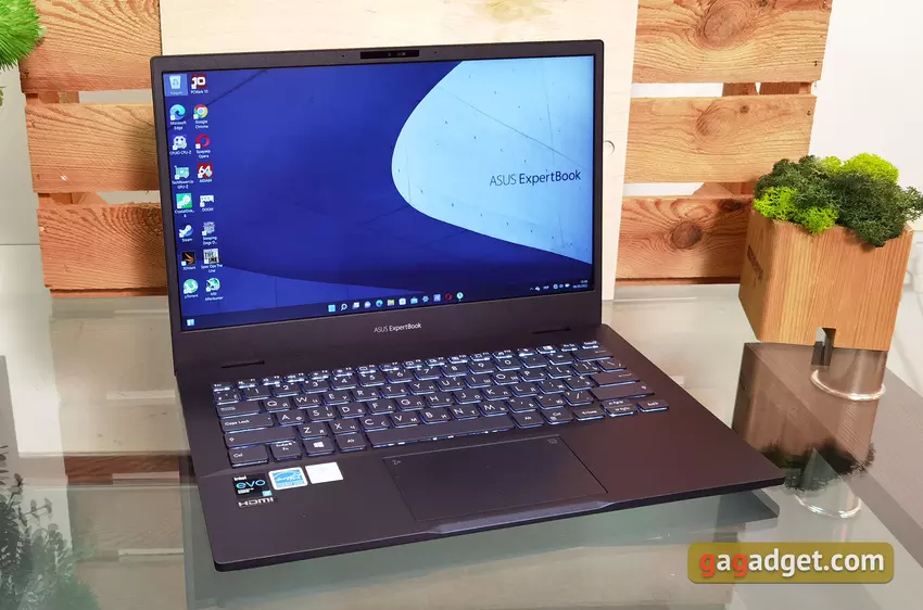 Die Abmessungen des Laptops betragen 309x210x17 mm und das Gewicht liegt bei etwa 1,1 kg, so dass es keine Probleme bereitet, es jeden Tag mit sich zu führen. Es passt in jeden Rucksack oder jede Tasche. Die Materialien und die Verarbeitungsqualität sind sehr gut. Deckel und Arbeitsfläche verbiegen sich nicht. Neben verstärkten Anschlüssen und Scharnieren erfüllt das Notebook die Anforderungen des amerikanischen Militärstandards MIL-STD-810H und besteht weitere ASUS-Tests. Details über die Testmethodik der gesamten ExpertBook-Linie finden Sie hier.
