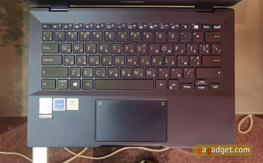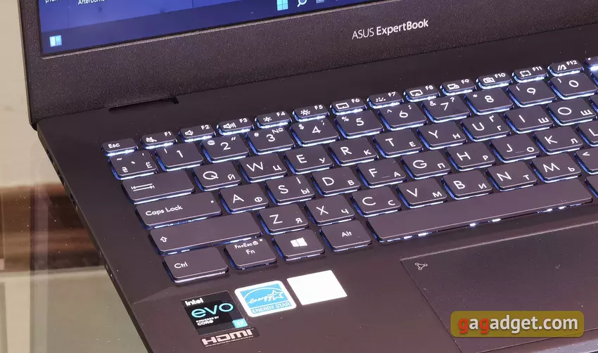 Das Touchpad hat eine gute Empfindlichkeit und eine angenehme Beschichtung, und im Allgemeinen ist es für die Arbeit mit Dokumenten völlig ausreichend. Allerdings würde ich mir wünschen, dass die Abmessungen etwas größer wären. Das Touchpad ist mit der digitalen NumberPad 2.0 Touch-Einheit kombiniert. Es wird durch eine Touch-Taste in der oberen rechten Ecke aktiviert. Und die Taste auf der linken Seite ist für die Helligkeit der Zeichen (Drücken) und den Start des Rechners (Streichen in eine beliebige Richtung von der Taste aus) zuständig.