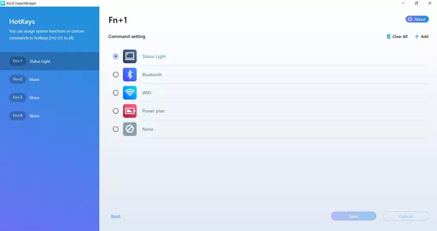 In der ASUS ExpertWidget-Anwendung können Sie Aktionen oder Funktionen über die Kombination von Fn+1, 2, 3, 4 konfigurieren. Dies kann das standardmäßige Ein- und Ausschalten von drahtlosen Schnittstellen oder das Ändern des Leistungsmodus sowie das Starten von Programmen sein.