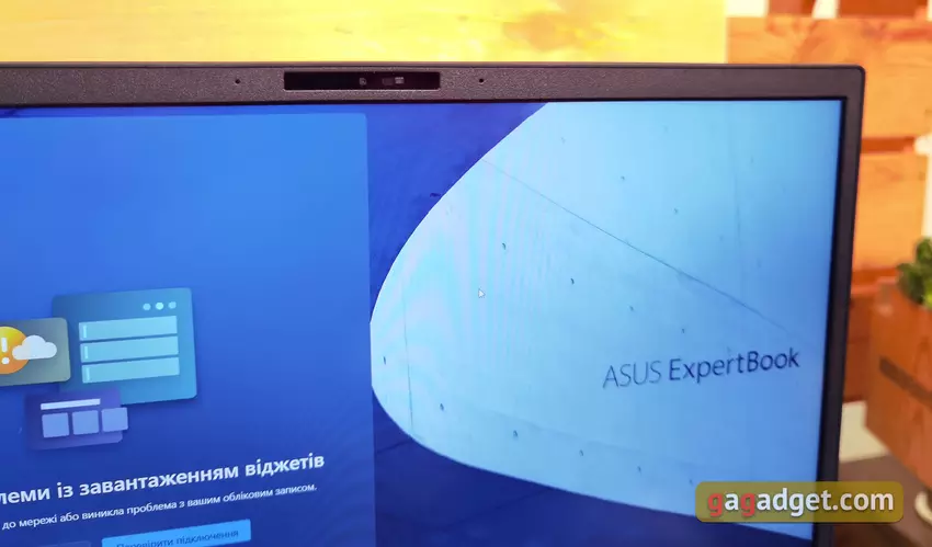Alle aktuellen ASUS ExpertBooks haben ein zurückhaltendes Erscheinungsbild, wie es sich im Unternehmenssegment gehört. Die Materialien des ASUS ExpertBook B5 unterscheiden sich jedoch etwas von den älteren Modellen ExpertBook B7 und ExpertBook B9, die fast vollständig aus einer Magnesium-Aluminium-Legierung gefertigt wurden. Beim heutigen Modell ist nur die Arbeitsfläche aus dieser Legierung gefertigt. Und die obere und untere Abdeckung sind aus Aluminium. Das Notebook ist dunkelblau und hat eine matte Oberfläche. Es sieht gut aus, aber auf der oberen Abdeckung sammeln sich ein wenig Fingerabdrücke, so dass man sie regelmäßig abwischen muss. Auf der oberen Abdeckung befindet sich das ASUS-Logo in der Mitte und ein kleines Logo der ExpertBook-Linie in der oberen linken Ecke. In der Nähe befindet sich eine LED, die anderen signalisiert, dass man gerade beschäftigt ist.Sie schaltet sich entweder automatisch bei Konferenzgesprächen ein oder kann durch Drücken von Fn+1 aktiviert werden.