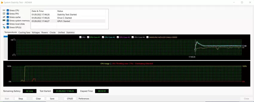 Das Kühlsystem im ASUS ExpertBook B5 ist ohne jegliche Designmerkmale. Es besteht aus einem Radiator, einer Heatpipe und einem Lüfter. Es hat sich aber als überraschend effektiv erwiesen, was allerdings auch an dem energieeffizienten Prozessor liegt. Im AIDA64-Stresstest erhitzen sich die Komponenten bei maximaler Belastung von Anfang an auf etwa 90° und der Prozessor verliert an Leistung. In etwa einer Minute passt sich das Kühlsystem an die Last an, das System arbeitet mit maximaler Effizienz und die Temperatur der Komponenten bleibt bei etwa 60°. Bei Büroanwendungen ist das Kühlsystem nicht hörbar. Unter Last ist das Geräusch minimal. Das Gehäuse über der Tastatur wird nur wenig warm.