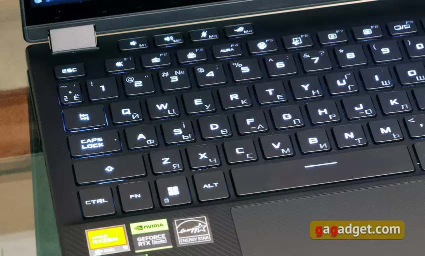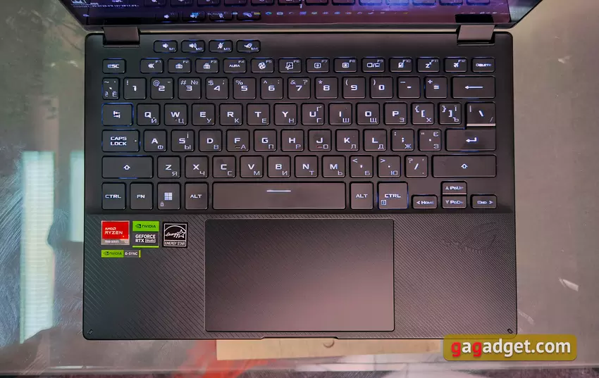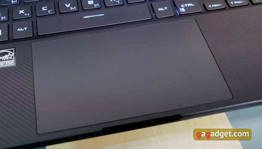 Im Vergleich zur vorherigen Version des ASUS ROG Flow X13 wurde das Touchpad um 56% vergrößert. Es ist wirklich groß: 129,7x76,8 mm. Es ist aus Glas gefertigt und hat eine ausgezeichnete Beschichtung und Empfindlichkeit. Natürlich sollte man für Spiele eine Maus anschließen, aber für alles andere ist es ausreichend.