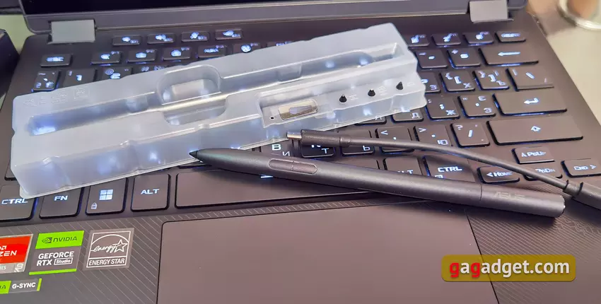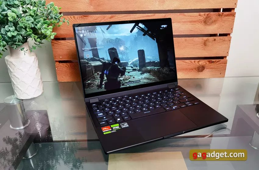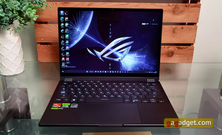 Die ASUS ROG Flow X13 Laptops verwenden leistungsstarke neue AMD Prozessoren der Phoenix Generation. Wir haben das Spitzenmodell AMD Ryzen 9 7940HS. Dabei handelt es sich um einen Octa-Core-Prozessor, der auf der Zen-4-Architektur basiert und in 4nm FinFET nach TSMC-Prozessstandards gefertigt wird. Er unterstützt bis zu 16 Threads (SMT) und verfügt über 16 MB Third-Level-Cache. Die Basisfrequenz liegt bei 4,0 GHz und die maximale Frequenz bei 5,2 GHz. In der Standardversion beträgt der TDP 35-54 W, aber ASUS ROG Flow X13 2023 kann auf bis zu 60 W übertakten. Es gibt einen eingebauten AMD Radeon 780M Grafikbeschleuniger mit 12 Compute Units basierend auf der RDNA-Architektur der 3. Dies ist eine der leistungsstärksten integrierten Lösungen, die derzeit erhältlich sind. Zusätzlichzur integrierten Grafikkarte gibt es eine diskrete NVIDIA GeForce RTX 4070 Laptop-Grafikkarte , was angesichts der Abmessungen des ASUS ROG Flow X13 2023 beeindruckend ist. Aber natürlich kann man in einem Ultrabook keine leistungsstarke Karte einbauen. Der Standard-TGP-Level beträgt in diesem Fall 45W plus ROG Boost 15W im Turbomodus. Die Standardfrequenz liegt bei 1230MHz, Boost bei 1280MHz. Der Videospeicher beträgt 8 GB GDDR6. Es gibt einen MUX-Switch-Multiplexer, der es Ihnen ermöglicht, eine diskrete Grafikkarte direkt an den Bildschirm zu schalten, anstatt über eine integrierte Karte. Dies reduziert die Latenzzeit und erhöht die Leistung in Spielen. Interessanterweise positioniert das Unternehmen das Notebook nicht als reine Gaming-Lösung. Das ASUS ROG Flow X13 2023 richtet sich auch an diejenigen, die viel mit Grafik und Videoverarbeitung arbeiten. Die entsprechenden NVIDIA Studio-Treiber sind bereits vorinstalliert. Der Arbeitsspeicher beläuft sich auf 32 GB LPDDR5 6400 MHz. Eine Aufrüstung ist nicht vorgesehen. Drahtlose Schnittstellen: Bluetooth 5.2 und schnelles Wi-Fi 6E (802.11ax) (Dualband) 2x2.