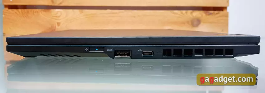 In Anbetracht der kompakten Größe des Laptops ist die Ausstattung mit Anschlüssen sehr gut. Auf der linken Seite befinden sich HDMI 2.1 (diskrete Videokarte), ein microSD-Kartenslot (UHS-II), eine kombinierte Audiobuchse und der proprietäre XG Mobile Connector unter einer Gummiabdeckung. Er beinhaltet einen proprietären PCIe 3.0 x8 mit 63 Gbps Bandbreite und USB Typ-C 3.2 Gen 2, der auch 130W Power Delivery und Display Port 1.4 mit G-Sync (funktioniert auch mit diskreter Grafik) unterstützt.