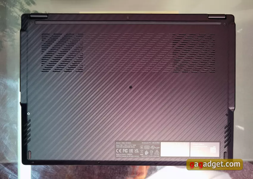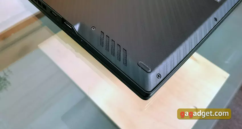 Die Unterseite des Notebooks ist ziemlich standardmäßig: Gummifüße, Lüftungslöcher über zwei Lüftern, Stereo-Lautsprecher, die leicht angewinkelt sind, und Schrauben, die den unteren Deckel sichern. Es ist nicht schwierig, den Deckel zu entfernen, aber es macht auch nicht viel Sinn, dies zu tun. Da es sich um ein Ultrabook handelt, sind die Aufrüstmöglichkeiten minimal. Der Arbeitsspeicher ist auf der Platine verlötet, und nur der Netzwerkadapter und das M.2 2230 SSD-Laufwerk sind zugänglich. Das 16-Zoll-ROG Flow X16 hat Platz für eine zusätzliche SSD. Das ASUS ROG Flow X13 hat keinen Platz dafür.