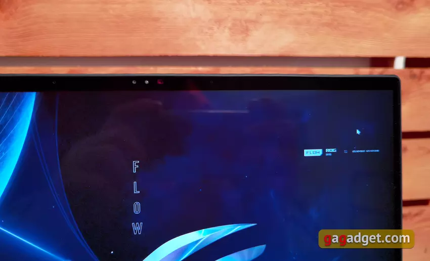 Das ASUS ROG Flow X13 2023 (GV302) ist ein Transformer mit einem Touchscreen-Display, daher ist das gesamte Panel durch Corning Gorilla Glass DXC geschützt. Die Ränder um das Display sind dünn, und die FullHD-Webcam und die Mikrofone befinden sich an ihren üblichen Stellen. Ergänzt werden sie durch eine Fortschrittsanzeige und eine Infrarotkamera zur Identifizierung des Besitzers. Einen Fingerabdruckscanner hat das Notebook nicht.