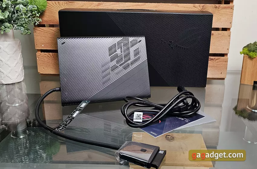 Es gibt viele Varianten des ASUS ROG Flow X16, die sich nicht nur in der Hardware im Inneren des Notebooks, sondern auch in der Verpackung unterscheiden. Derzeit ist in der Ukraine nur eine Konfiguration mit einer externen Grafikkarte ROG XG Mobile AMD Radeon RX 6850M XTerhältlich . Das gesamte Set wird in einer großen schwarzen Box geliefert, in der sich zwei kleinere Boxen befinden. Eine enthält die externe Grafikkarte, die andere den Laptop und das Zubehör. Dazu gehören ein 240-W-Hauptnetzteil mit Stromkabel, ein zusätzliches 100-W-Kompaktnetzteil mit Type-C, ein Markenstift und Dokumentation.