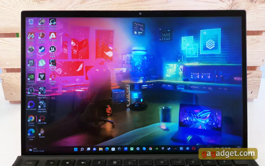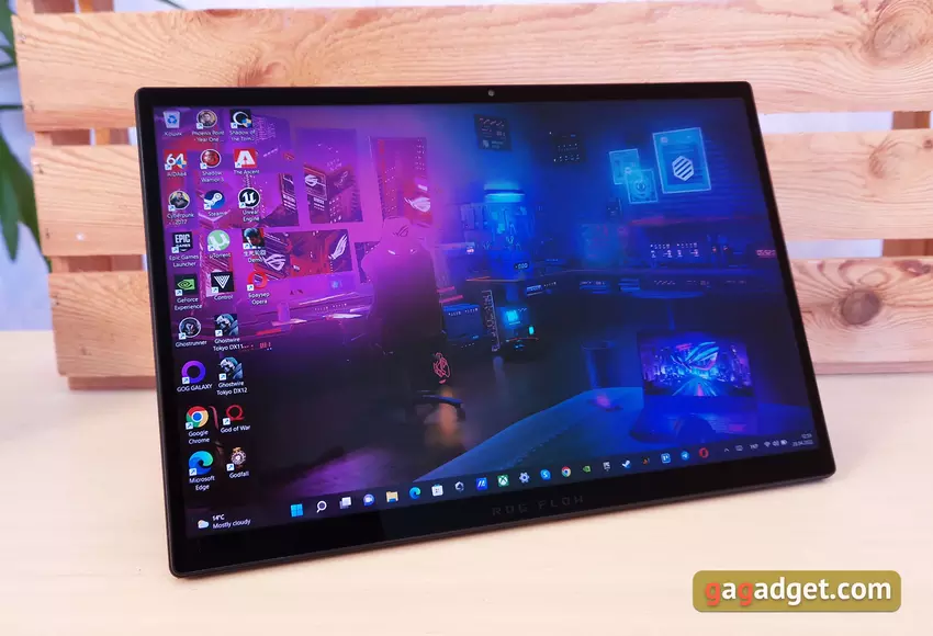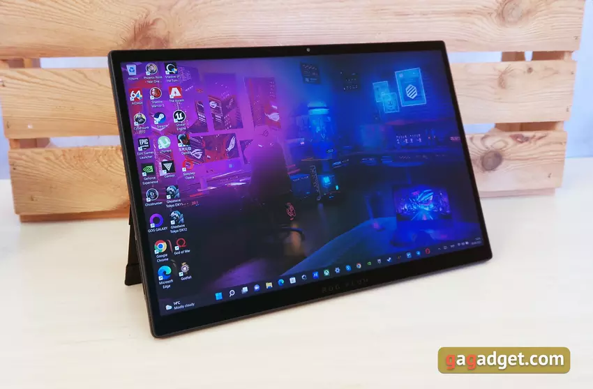 Das ASUS ROG Flow Z13 verfügt über einen Touchscreen mit einer Diagonale von 13,4 Zoll und einem Seitenverhältnis von 16:10. Vor kurzem hat ASUS (und nicht nur) aktiv damit begonnen, dieses Seitenverhältnis in Laptops zu verwenden. Beide spielen und arbeiten recht komfortabel. In verschiedenen Konfigurationen kann es entweder eine Option mit einer Auflösung von 4K 3840 x 2400 und einer Bildwiederholfrequenz von 60 Hz oder 1920 x 1200, aber mit einer Frequenz von 120 Hz geben. Es werden IPS-Matrizen mit einer deklarierten maximalen Helligkeit von 500 verwendetcd/m2, Zertifizierung Pantone, Unterstützung für Dolby Vision und Adaptive Sync-Bildratensynchronisierung. Wir haben eine Version mit einem FullHD-120-Hz-Bildschirm erhalten, was (meiner persönlichen Meinung nach) in diesem Fall optimal ist. Es ist von ausgezeichneter Qualität, mit sehr satten Farben, maximalen Betrachtungswinkeln und einem beeindruckenden Helligkeitsspielraum. Das einzige, woran man denken muss, ist, dass es mit Schutzglas bedeckt ist und natürlich blendet.