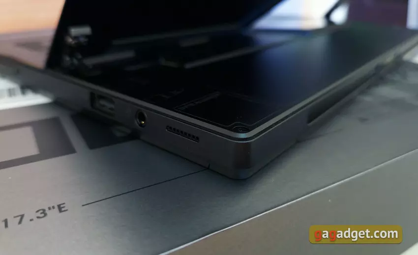 Auf der rechten Seite befindet sich ein weiterer Lautsprecher, ein Netzschalter mit integriertem Fingerabdruckscanner, eine Lautstärkewippe, ein einzelner USB 2.0 in voller Größe und eine 3,5-mm-Kombi-Audiobuchse. Die Anzahl der Anschlüsse ist wirklich sehr bescheiden, aber bei diesem Formfaktor muss man Kompromisse eingehen. Dies ist vollständig mit gelöst ROG XG Mobile, das über zusätzliche Videoausgänge in voller Größe und USB-Anschlüsse verfügt.