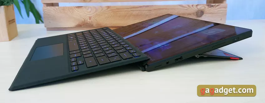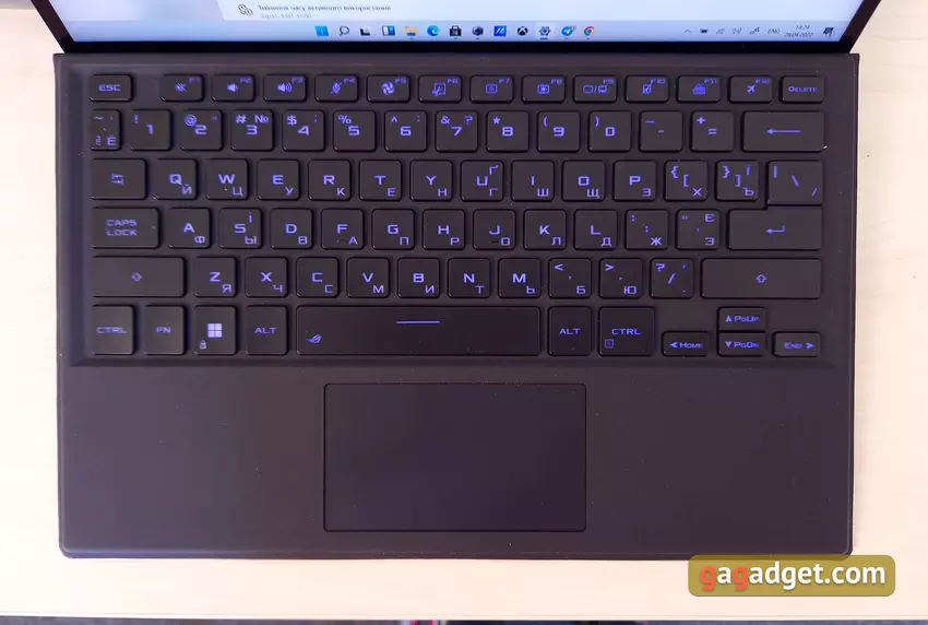 Kommen wir nun zu bekannteren Steuerelementen. Die vollständig abnehmbare Tastatur hat eine Reihe ihrer Vorteile und vielleicht nur einen Nachteil (in Anbetracht des Formfaktors). Die Abmessungen und das Layout sind klassische Ultrabooks, ohne jegliche Funktionen, sodass Sie sich nicht lange daran gewöhnen müssen. Die oberste Reihe der Funktionstasten ist in der Höhe reduziert. Es endet mit der Entf-Taste. Der Pfeilblock hat auch eine reduzierte Höhe. Die Pfeile sind über Fn auf Home, End, PgUp, PgDown ausgerichtet.