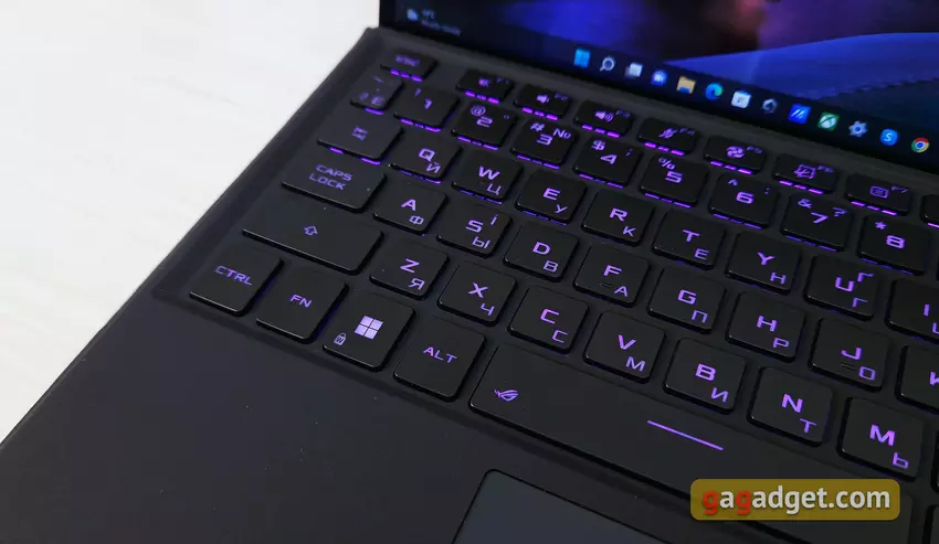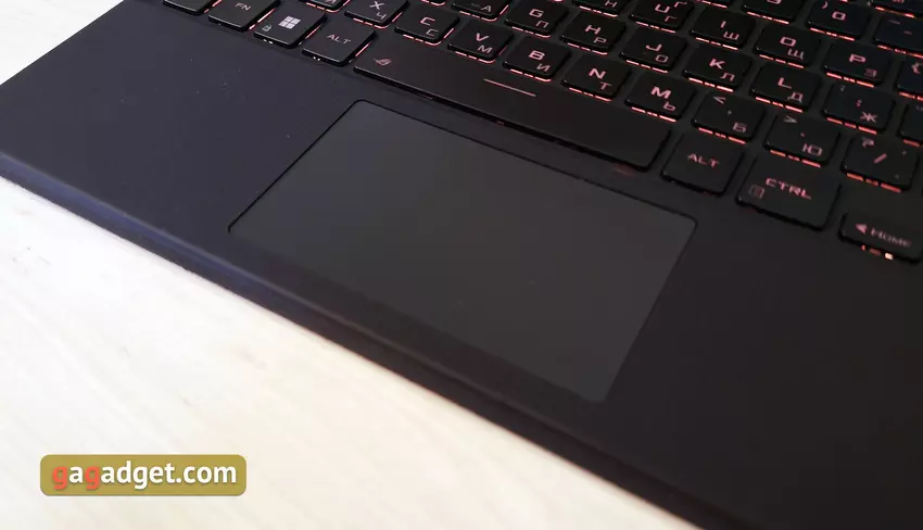 Die Tasten haben ein sehr angenehmes, informatives Klicken. Der Hub beträgt 1,7 mm, was für solche Abmessungen sehr gut ist. Es gibt eine anpassbare RGB-Hintergrundbeleuchtung mit drei Helligkeitsstufen und Unterstützung für Aura Sync. Die einzige kleine Beschwerde über die Tastatur bezieht sich auf das Design selbst: Aufgrund ihrer geringen Dicke biegt sie sich ein wenig.