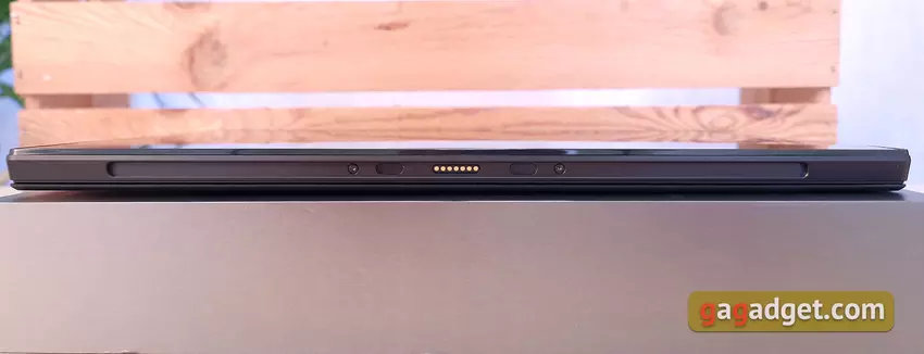 An der Unterseite befindet sich ein massives, faltbares, verstellbares Bein, um das Tablet in den gewünschten Winkel zu bringen. Darunter verbargen sie einen Steckplatz zum Installieren einer MicroSD-Speicherkarte sowie eine Abdeckung, unter der sich ein SSD-Laufwerk befindet. Auch hier musste der Hersteller Abstriche machen: Die PCIe-4.0-Schnittstelle wird unterstützt, das Format ist aber nur M.2 2230, nicht das übliche 2280. Bisher ist das Angebot an SSDs sehr bescheiden und deren Geschwindigkeit geringer als die von 2280 in voller Größe mit PCIe 4.0-Schnittstelle.