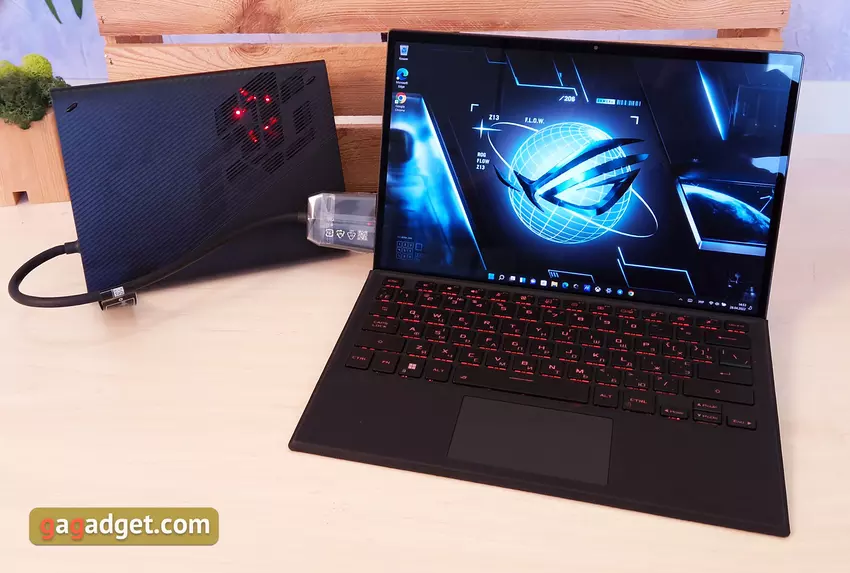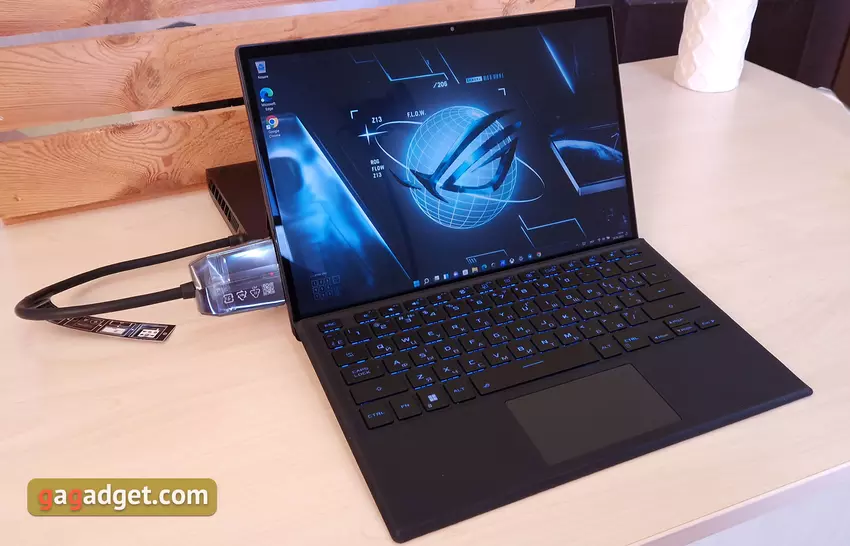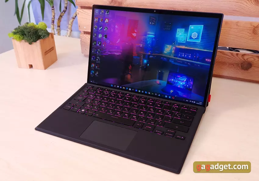 ASUS ROG Flow Z13 wurde als das vielseitigste Gerät mit einer Reihe von Anwendungsfällen konzipiert. Dementsprechend kann es als normales Ultrabook verwendet werden, indem eine vollständige Tastatur angeschlossen wird, als Tablet, um sich einen Film im Liegen anzusehen, eine externe Grafikkarte, einen Monitor / Fernseher, ein Gamepad oder Ihre bevorzugte mechanische Tastatur mit einer Maus daran anzuschließen und damit zu spielen absoluter Komfort.