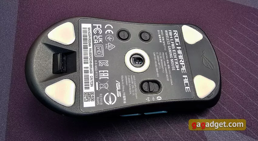 An der Unterseite der Maus befinden sich vier dreieckige weiße Teflonfüße, ein optischer ROG AimPoint-Sensor mit einem runden Tefloneinsatz, ein Schalter für den Verbindungsmodus, ein Stauraum für einen USB-Sender und Tasten zum Umschalten von DPI und Verbindungsmodi. Sie haben zusätzliche Funktionen, aber dazu später mehr.