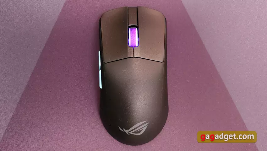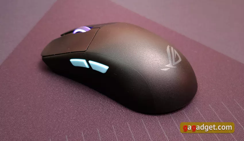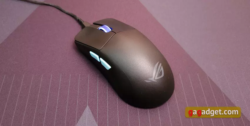 Die Haupttasten verwenden ASUS ROG Micro Switch-Schalter mit einer Lebensdauer von 70 Millionen Klicks. Sie haben einen sehr schönen, klaren und informativen Klick. Die Zusatztasten sind ebenfalls bequem und haben einen deutlichen Abstand. Aber das Rad ist nicht sehr gelungen. Wenn man langsam scrollt, arbeitet es leise, aber die Abtrennungen sind nicht sehr deutlich. Bei schnellem Scrollen sind die Abtrennungen zwar deutlich, aber der Kraftaufwand ist deutlich höher und das Rad beginnt zu rumpeln.